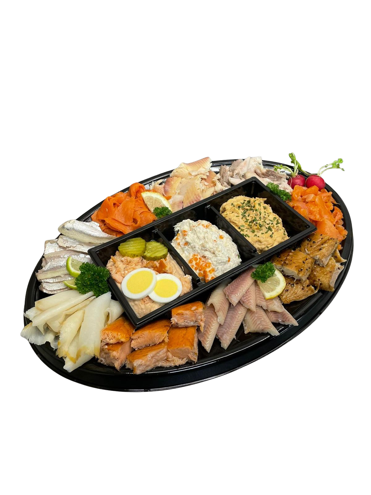 Palingfilet, makreelfilet, wilde zalmfilet, zalmfilet, sprotfilet, forelfilet, heilbotfilet, forelchampagnesalade, gerookte zalmsalade, makreel americain, warme gerookte zalm en pepermakreel.
